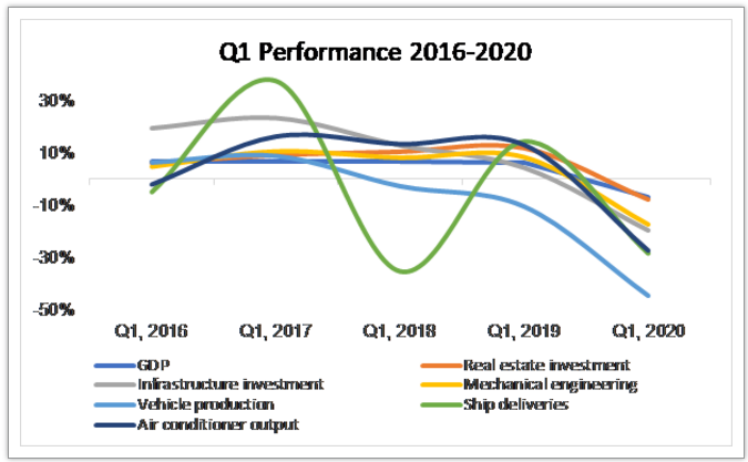 其中包括:GDP下降6.8%,房地产投资下降7.7%,基建投资下降19.7%,通用机械下降17.2%,汽车产量下降44.6%,船舶交货量下降28.5%,空调产量下降27.5%。